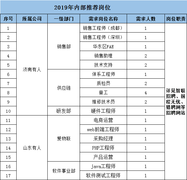 有人物聯(lián)網(wǎng)開啟新年招聘計劃,有需要的童鞋可關(guān)注公眾號“有人物聯(lián)網(wǎng)”,或前往智聯(lián)、無憂、獵聘等招聘網(wǎng)站了解詳情。