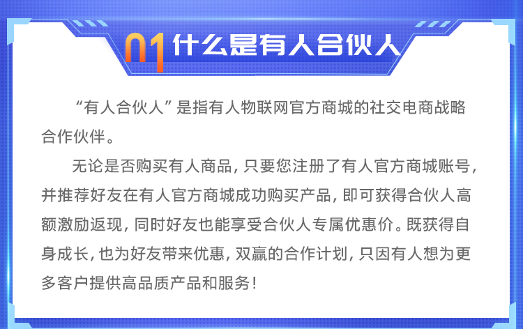 為答謝老客戶一直以來對有人品牌的支持與信賴,有人物聯(lián)網(wǎng)特此推出“合伙人”(點擊藍字快速參加)活動,希望通過本活動,為廣大老客戶及身邊朋友帶來“雙重福利”。