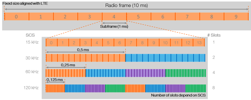 5G使用4G的無線電幀結(jié)構(gòu)作為參考,該幀的持續(xù)時間為10毫秒,其中包含10個時隙,每個時隙1毫秒。在4G中,調(diào)度是基于時隙進行的,這意味著時隙是我們可以調(diào)度用戶的最小粒度。增大載波之間的空間意味著在1毫秒內(nèi)可以容納多個插槽。例如,在1毫秒的時間段內(nèi),只能使用15 kHz SCS傳輸一個時隙;但是,2個插槽可以安裝30 kHz SCS,4個插槽可以安裝60 kHz SCS,甚至8個插槽可以安裝120 kHz SCS。每個子幀具有更多時隙的主要優(yōu)點是具有更多的調(diào)度機會,因此有更多的重傳可能性,這對于提高可靠性至關(guān)重要。
