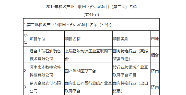 為貫徹山東省委辦公廳、省政府辦公廳《關(guān)于支持發(fā)展“十強(qiáng)”現(xiàn)代優(yōu)勢產(chǎn)業(yè)集群財(cái)政政策的實(shí)施意見》的精神,進(jìn)一步推進(jìn)實(shí)施山東“個十百”產(chǎn)業(yè)互聯(lián)網(wǎng)平臺培育工程,經(jīng)企業(yè)(單位)自愿申報(bào)、各市工業(yè)和信息化局及行業(yè)協(xié)會推薦、專家評審等程序,山東省工業(yè)和信息化廳組織開展了2019年省級產(chǎn)業(yè)互聯(lián)網(wǎng)平臺示范項(xiàng)目(第二批)的遴選工作。