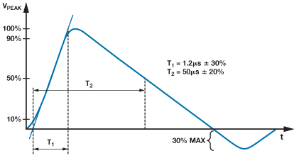 在浪涌測試期間,五個正脈沖和五個負脈沖被施加到數(shù)據(jù)端口,每個脈沖之間的最大時間間隔為一分鐘。該標準規(guī)定,應在測試期間將設備設置在正常操作條件下。
