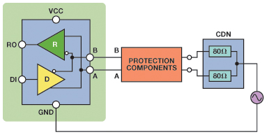 電阻將浪涌瞬變耦合到通信線路上。上圖顯示了半雙工RS-485設備的耦合網(wǎng)絡。電阻的總并聯(lián)總和為40。對于半雙工設備,每個電阻為80。