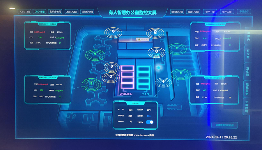 ● 環(huán)境監(jiān)控:我們加上環(huán)境傳感器,可以采集辦公室的甲醛、溫度、濕度以及二氧化碳和PM2.5的含量。例如公司內(nèi)研發(fā)同事比較多,如果二氧化碳比較高“標(biāo)紅”的話,可以通過(guò)開(kāi)創(chuàng)、開(kāi)新風(fēng)系統(tǒng)的方式提升我們的氧氣含量,提高我們的工作效率