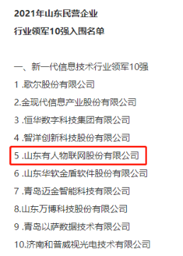 憑借在物聯(lián)網(wǎng)領域的持續(xù)貢獻與影響力,山東有人物聯(lián)網(wǎng)股份有限公司成功入圍2021年山東民營企業(yè)新一代信息技術行業(yè)領軍10強。