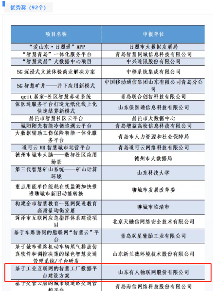 近日,由國(guó)家信息中心指導(dǎo),山東省大數(shù)據(jù)局主辦的第一屆新型智慧城市大賽頒獎(jiǎng)儀式在青島市完美收官。有人物聯(lián)網(wǎng)申請(qǐng)的基于物聯(lián)網(wǎng)化的智慧農(nóng)業(yè)監(jiān)測(cè)解決方案、綜合商務(wù)樓宇物業(yè)設(shè)備管理智能化改造解決方案和基于工業(yè)互聯(lián)網(wǎng)的智慧工廠數(shù)據(jù)平臺(tái)建設(shè)方案在全國(guó)20個(gè)省、48個(gè)市的2000個(gè)參賽項(xiàng)目,突出重圍,三次上榜第一屆中國(guó)新型智慧城市創(chuàng)新應(yīng)用大賽?興業(yè)賽道獲獎(jiǎng)名單,分別獲二等獎(jiǎng)“智優(yōu)獎(jiǎng)”、三等獎(jiǎng)“智佳獎(jiǎng)”、優(yōu)秀獎(jiǎng)“智成獎(jiǎng)”。這極大程度彰顯了有人物聯(lián)網(wǎng)在數(shù)字產(chǎn)業(yè)化、產(chǎn)業(yè)數(shù)字化方面的解決方案的高推廣價(jià)值和高商業(yè)價(jià)值,展示了有人物聯(lián)網(wǎng)在智慧城市建設(shè)方面的卓越能力和強(qiáng)大實(shí)力。