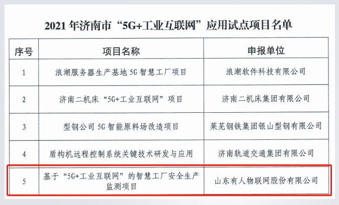 3月1日,濟南市工業(yè)和信息化局發(fā)布《關(guān)于公布2021年濟南市“5G+工業(yè)互聯(lián)網(wǎng)”應用試點示范項目名單的通知》。有人物聯(lián)網(wǎng)“基于‘5G+工業(yè)互聯(lián)網(wǎng)’的智慧工廠安全生產(chǎn)監(jiān)測項目”成功獲選。