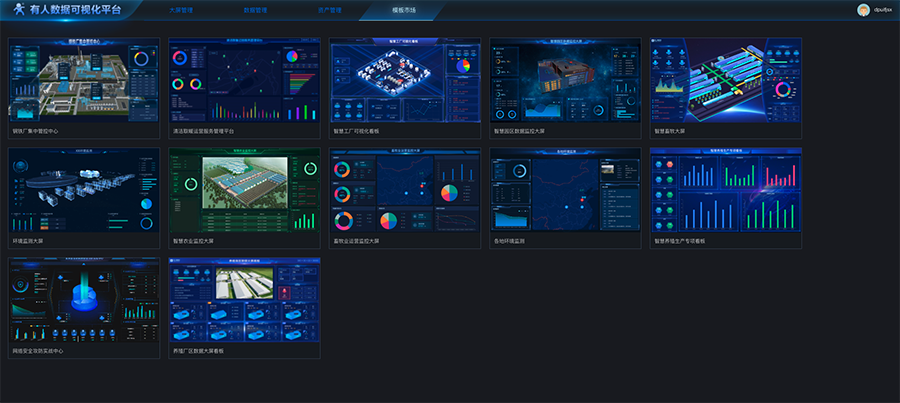 2、監(jiān)控大屏支持自定義,可以自行繪制后替換默認大屏,也可以使用現(xiàn)成的大屏模板一鍵獲得專業(yè)酷炫大屏。