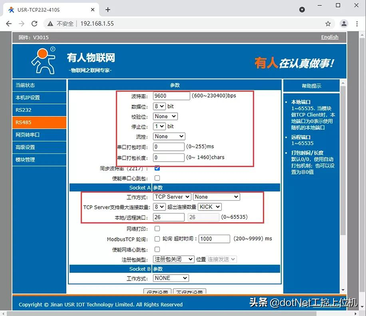 切換到RS485設(shè)置頁(yè)面,主要是設(shè)置一下串口參數(shù)和Socket參數(shù)。