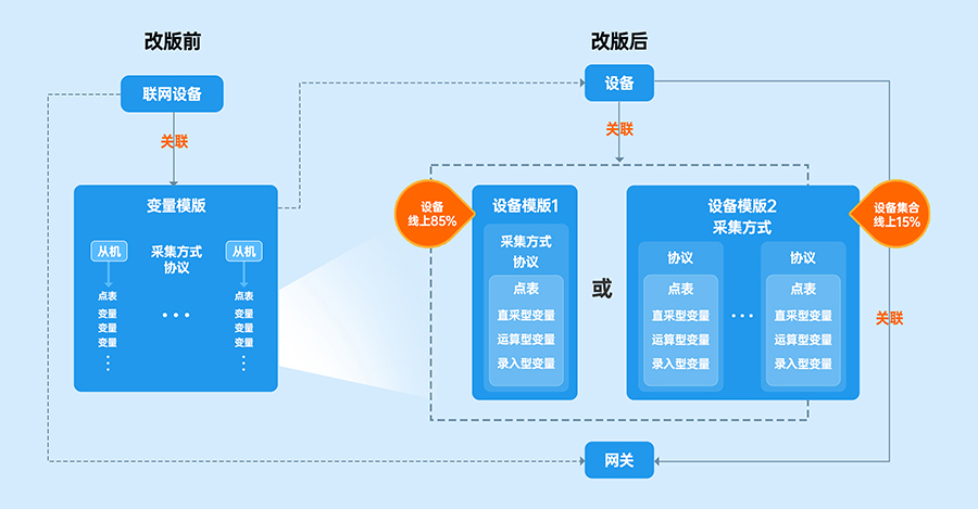 改版后:從機(jī)地址轉(zhuǎn)移至設(shè)備上配置,模板僅定義采集協(xié)議、輪詢規(guī)則和計(jì)算規(guī)則,大大提升設(shè)備模板的復(fù)用性,增強(qiáng)設(shè)備和設(shè)備模板之間關(guān)聯(lián)的靈活性;