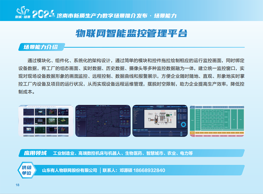其中,有人物聯(lián)網(wǎng)“物聯(lián)網(wǎng)智能監(jiān)控管理平臺”是針對行業(yè)用戶互聯(lián)網(wǎng)碎片化需求、企業(yè)客戶開發(fā)技術(shù)門檻高和開發(fā)周期長等問題,打造的快速自定義物聯(lián)網(wǎng)應用的數(shù)據(jù)服務平臺,具有接入能力強、安全性高、應用便捷等優(yōu)點,可通過模塊化、組件化、系統(tǒng)化的架構(gòu)設計,運用簡單的模塊和控件繪制相應的運行監(jiān)控畫面,同時綁定設備數(shù)據(jù),將工廠的組態(tài)畫面、實時數(shù)據(jù)、歷史數(shù)據(jù)、攝像頭等多種監(jiān)控數(shù)據(jù)融為一體,建立統(tǒng)一監(jiān)控窗口,實現(xiàn)對現(xiàn)場設備數(shù)據(jù)形象的畫面監(jiān)控、遠程控制、數(shù)據(jù)曲線和報警展示,方便企業(yè)隨時隨地、直觀、形象地實時掌控工廠內(nèi)設備及項目的運行狀況,實現(xiàn)設備遠程運維管理,擺脫時空限制,助力企業(yè)提高生產(chǎn)效率,降低控制成本。目前,平臺基于“云端+終端”一體化模式,提供“+物聯(lián)網(wǎng)”服務能力,聚焦工業(yè)、農(nóng)業(yè)、環(huán)保等16個行業(yè)及19個場景,可廣泛應用在工業(yè)制造業(yè)、高端數(shù)控機床與機器人、生物醫(yī)藥、智慧城市、農(nóng)業(yè)、電力、共享等多種行業(yè),為企業(yè)、行業(yè)和地區(qū)的數(shù)字化轉(zhuǎn)型發(fā)展提供賦能。