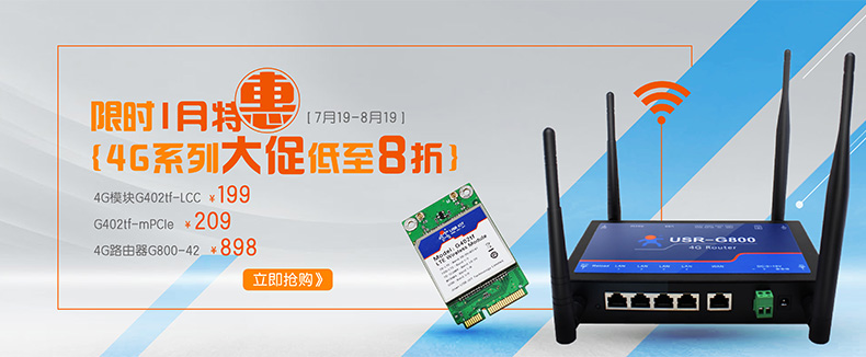 4G無線路由器USR-G800價格直降100元,價格為898元。如此大幅降價,跌破行業(yè)底價,怎能不讓人心動!