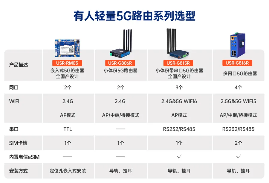 有人輕量5G路由模塊RM05,可快速嵌入到5G CPE、5GMiFi中,實現(xiàn)5G轉有線、5G轉WiFi,支持外插卡,可任意搭配四大運營商5G/4G流量卡實現(xiàn)流量運營。