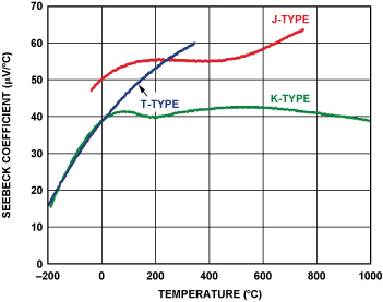 圖3.熱電偶靈敏度隨溫度而變化注意,從0°C至1000°C,K型塞貝克系數(shù)大致恒定在約 41 μV/°C
