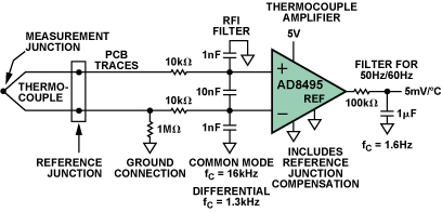 因為電壓信號微弱,信號調(diào)理電路一般需要約100左右的增益,這是相當(dāng)簡單的信號調(diào)理。更棘手的事情是如何識別實際信號和熱電偶引線上的拾取噪聲。熱電偶引線較長,經(jīng)常穿過電氣噪聲密集環(huán)境。引線上的噪聲可輕松淹沒微小的熱電偶信號。