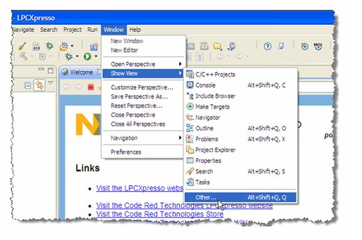 LPCXpresso IDE基于Eclipse IDE框架,在Eclipse文檔中有很多內(nèi)核特征的詳細(xì)描述,在幫助菜單中可以發(fā)現(xiàn)這些幫助文件。更多的用戶文檔可以到Code Red的網(wǎng)站上獲得。4.1 LPCXpresso的桌面布局 LPCXpresso桌面包含很多窗口,每一個窗口分別顯示LPCXpresso環(huán)境一個特定的詳細(xì)數(shù)據(jù),因而被稱為觀察窗口,這些數(shù)據(jù)可以是源代碼、hex數(shù)據(jù)、反匯編、存儲器內(nèi)容等等。觀察窗口可以打開、移動、固定、關(guān)閉,并且當(dāng)前的窗口布局可以保存和恢復(fù)。一個特殊的窗口配置稱之為“透視圖”。在LPCXpresso中,無論代碼編寫還是調(diào)試都在一個界面下進(jìn)行。這種方式使得開發(fā)工作變得簡單和高效。所有的觀察窗口都可以隨意拖動。如果一個觀察窗口被無意關(guān)閉了,可以從“Show View”對話框中再次打開。“Show View”對話框可以從“Window”---“Show View”---“other”中打開,如下圖所示。