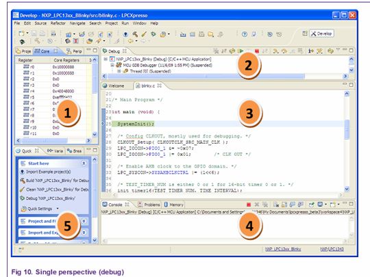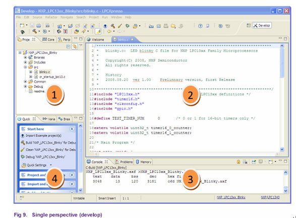 在LPCXpresso開發(fā)界面里,快速啟動面板里包含了使用最頻繁的各種操作選項。它位于窗口的左下角。