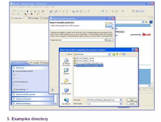 l 在快速啟動面板中,單擊“Start Here”,然后選擇”Import Example project(s)“。如下圖所示。l 在彈出的頁面中,從“Browse”中選擇例程所在的目錄。根據(jù)提示打開例程即可。如下圖。