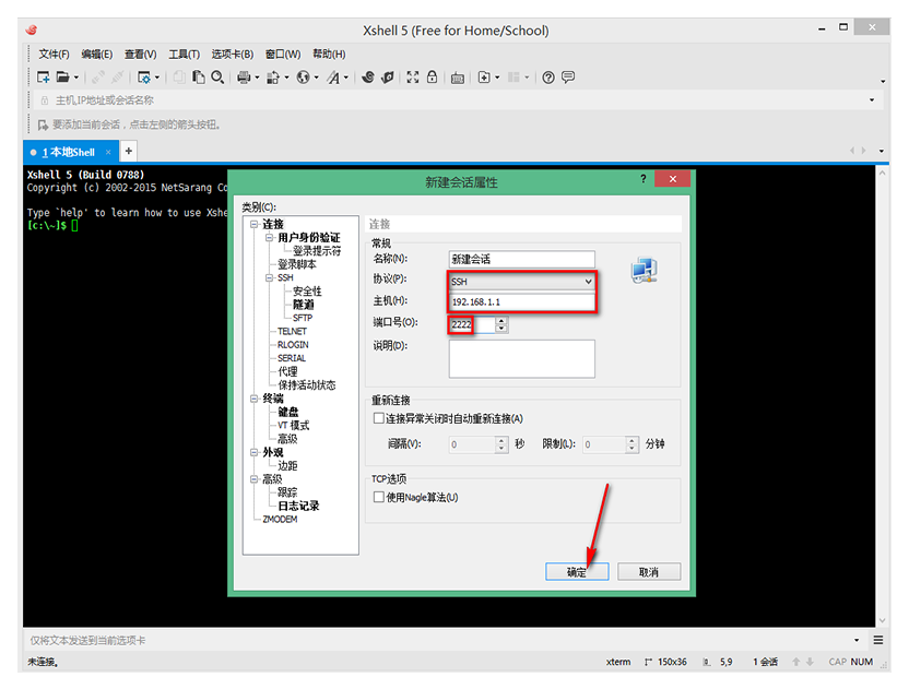 步驟三,打開軟件,點擊“新建”,協(xié)議選為ssh主機填寫192.168.1.1 ,端口號填寫2222,點擊“確定”按鈕,進行下一步。