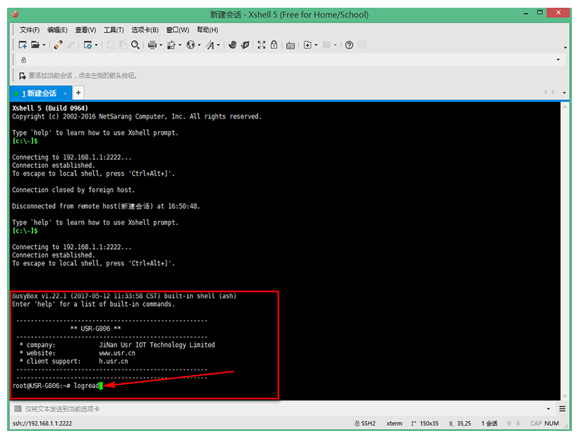 以有人的4G工業(yè)路由器USR-G806為例,它是通過Xshell5軟件讀取路由器LOG日志的。
