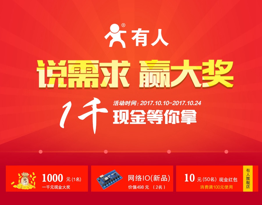 參與獎(50名) :有人天貓旗艦店10元紅包(消費滿100元使用)