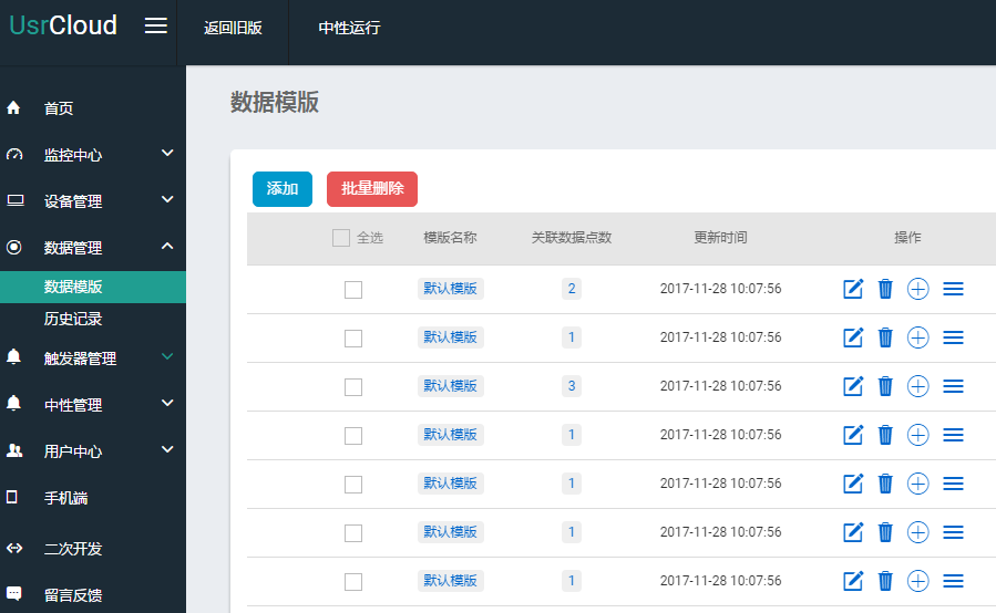把數(shù)據(jù)點(diǎn)放到模板里,添加設(shè)備的時候只要關(guān)聯(lián)模板就行了,不用再編輯每個數(shù)據(jù)點(diǎn)了。(由于之前的版本有幾百個數(shù)據(jù)點(diǎn),每次添加設(shè)備都需要編輯一遍,用戶表示比較累,因此透傳云升級版本時做了人性化處理)。