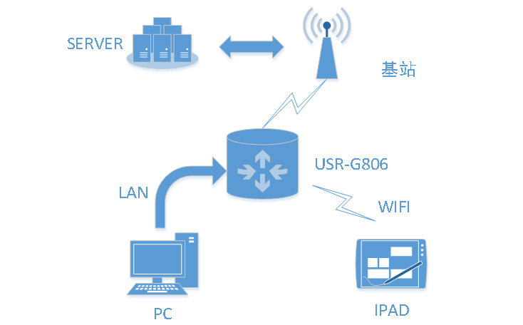 4G工業(yè)路由器以USR-G806為例,將工業(yè)路由器上電啟動(dòng)后,會(huì)根據(jù)用戶(hù)預(yù)先設(shè)置好的參數(shù),自動(dòng)連接4G網(wǎng)絡(luò)并使LAN下的設(shè)備可訪問(wèn)外部網(wǎng)絡(luò)。
