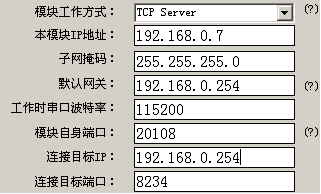 本模塊IP地址 為模塊所在的局域網(wǎng)內(nèi)給模塊分配一個(gè)局域網(wǎng)IP地址如這里的192.168.0.7,子網(wǎng)掩碼保持默認(rèn)255.255.255.0,