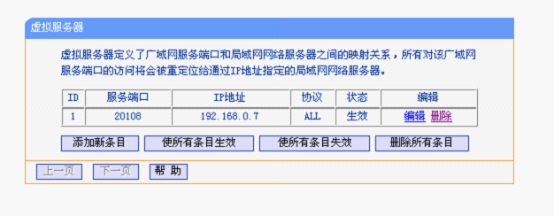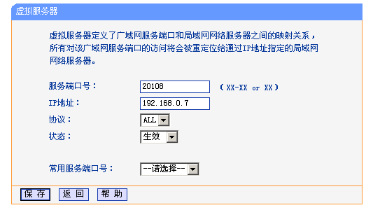 2、在局域網(wǎng)的路由器上做端口轉(zhuǎn)發(fā),這里以TP-LINK的設(shè)置為例,要做的是將外網(wǎng)連接的20108端口轉(zhuǎn)發(fā)到局域網(wǎng)內(nèi)部的192.168.0.7這個(gè)IP上。