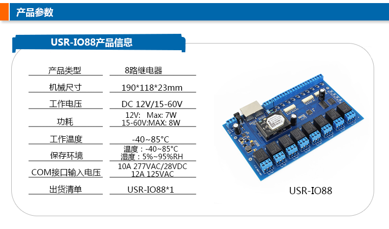 USR-IO88是本公司新推出的8入8出控制設備,用戶可以在直連,局域,遠程三種方式下實時,定時控制設備。輸出部分我們將繼電器三個端子全部引出供用戶使用,輸入部分我們提供網(wǎng)頁配置輸入模式,可在純輸入方式,控制繼電器方式之間任意切換。