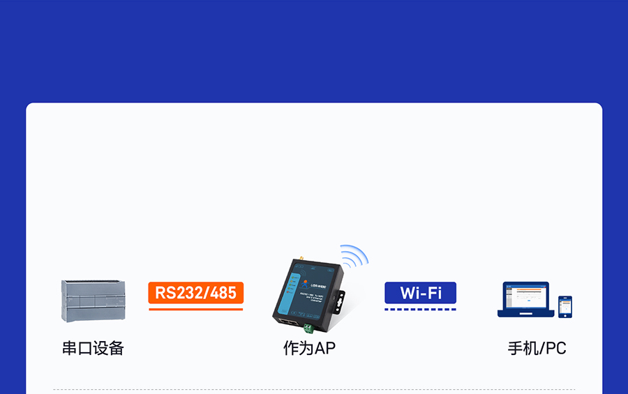USR-w630作為無(wú)線AP使用,提供Wi-Fi接入點(diǎn)功能,可實(shí)現(xiàn)串口終端與