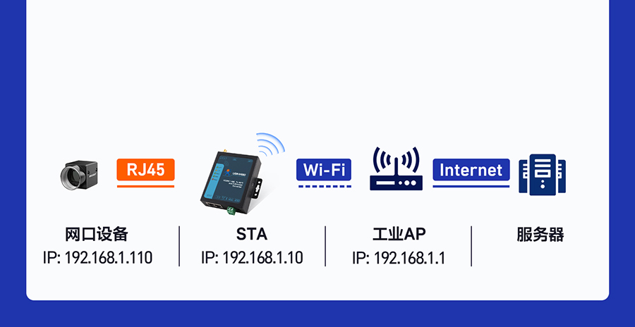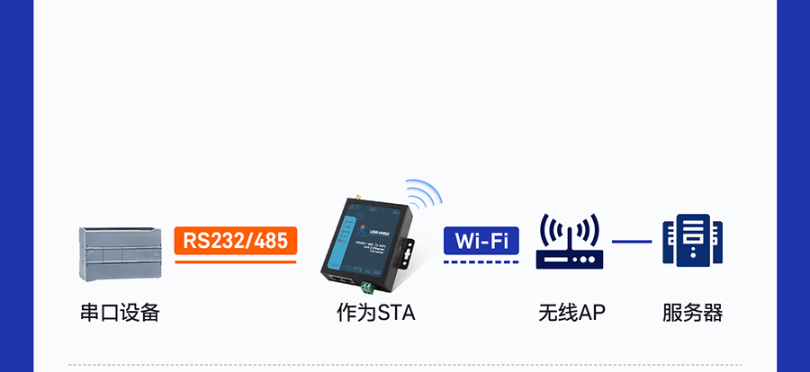 USR-w630作為STA使用,通過(guò)Wi-Fi連接其他AP設(shè)備(如路由器),實(shí)現(xiàn)