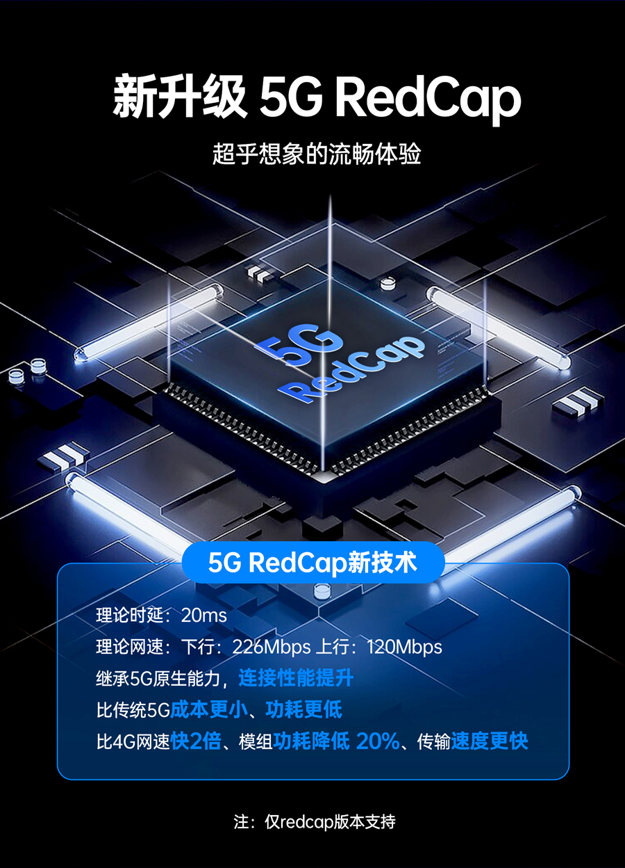 繼承5G原生能力,連接性能提升比傳統(tǒng)5G成本更小、功耗更低。比4G網(wǎng)速快2倍、模組功耗降低 20%、傳輸速度更快。