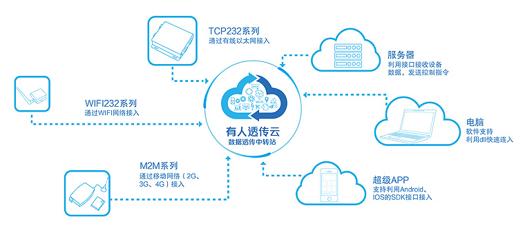 產(chǎn)品支持接入“有人透傳云系統(tǒng)”,實現(xiàn)設(shè)備與網(wǎng)絡(luò)終端的跨網(wǎng)絡(luò)數(shù)據(jù)傳輸。輕松實現(xiàn)遠(yuǎn)程數(shù)據(jù)采集、遠(yuǎn)程控制功能。