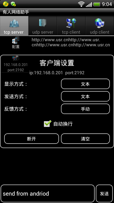 安卓 android 網(wǎng)絡(luò)調(diào)試助手 (TCPIP UDP 測(cè)試),這是一個(gè)手機(jī)或者平板上調(diào)試TCPIP通訊的工具,配置WIFI轉(zhuǎn)串口模塊,就可以實(shí)現(xiàn)手機(jī)調(diào)試串口通訊了。本軟件支持TCP Server, TCP Client, UDP Server, UDP client 模式,支持中英文自動(dòng)識(shí)別切換。