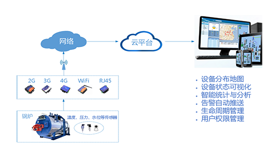 通過(guò)2G/3G/4G網(wǎng)絡(luò)或?qū)拵ЬW(wǎng)絡(luò)實(shí)現(xiàn)鍋爐設(shè)備聯(lián)網(wǎng),實(shí)時(shí)接收鍋爐設(shè)備運(yùn)行參數(shù),如溫度、水位、壓力參數(shù)等,并進(jìn)行存儲(chǔ)和管理。通過(guò)瀏覽器或手機(jī)客戶端實(shí)時(shí)顯示所有已聯(lián)網(wǎng)設(shè)備的實(shí)時(shí)運(yùn)行情況,對(duì)鍋爐狀態(tài)數(shù)據(jù)進(jìn)行智能分析,為設(shè)備運(yùn)維階段故障分析、高效管理和穩(wěn)定運(yùn)行提供有力支持。