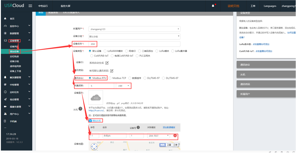 2、登錄云平臺,添加設(shè)備和數(shù)據(jù)模板