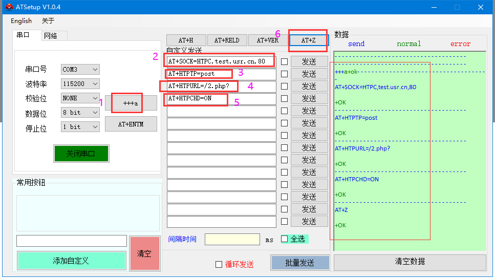 2.AT+SOCK=HTPC,test.usr.cn,80設(shè)置/查詢網(wǎng)絡(luò)協(xié)議參數(shù)格式