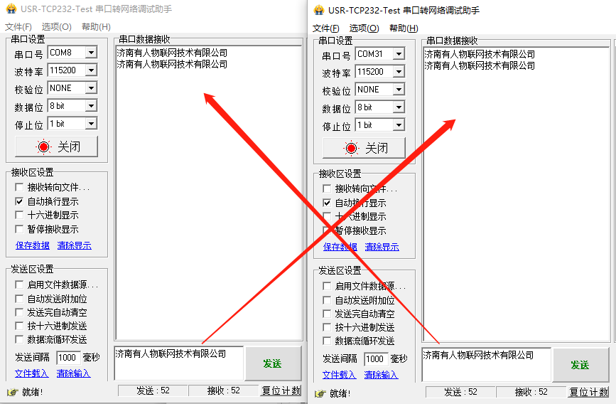 7、打開兩個串口調(diào)試助手,分別選擇正確的串口以及串口參數(shù),實現(xiàn)兩個串口直接數(shù)據(jù)互發(fā)。