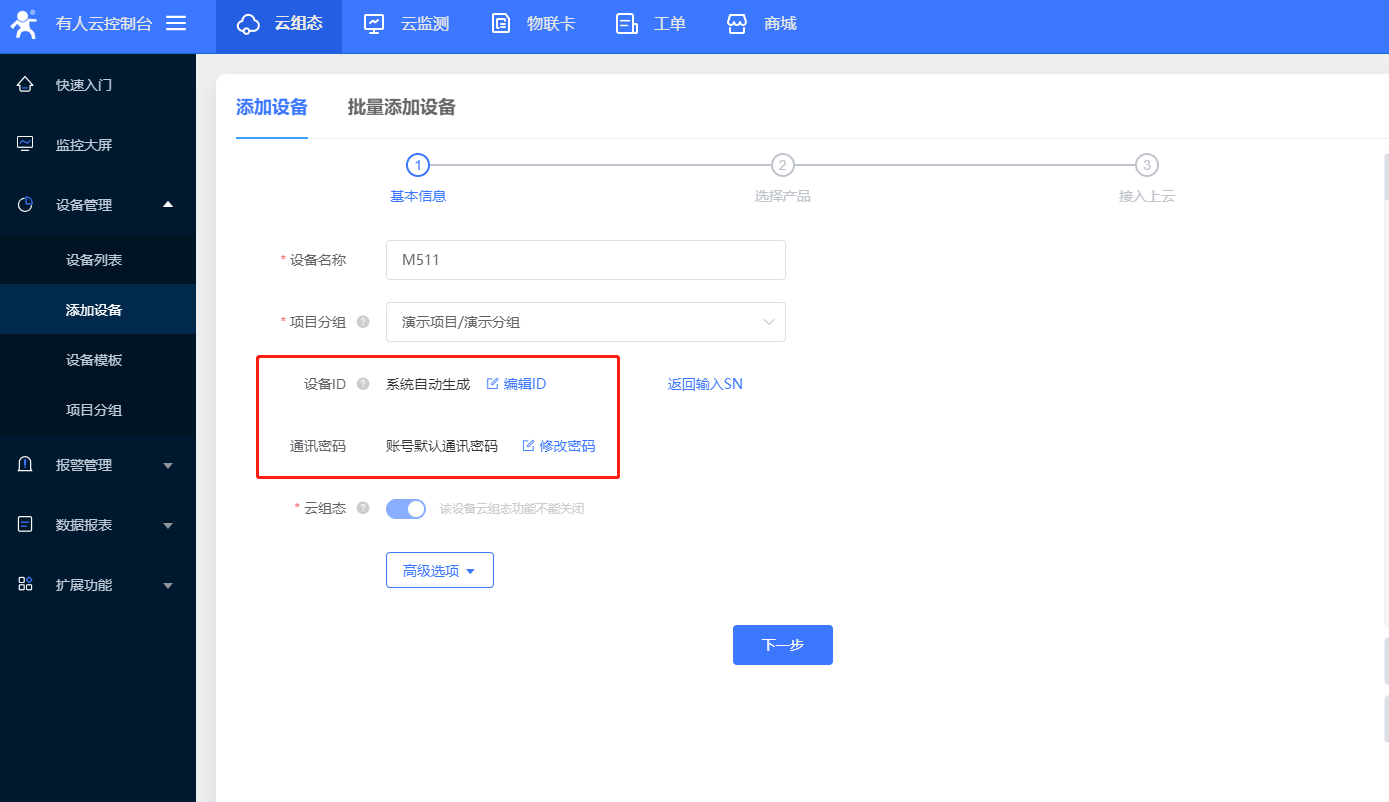 3.默認生成SN和通信密碼,點擊下一步