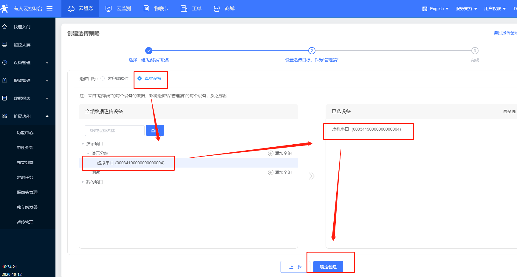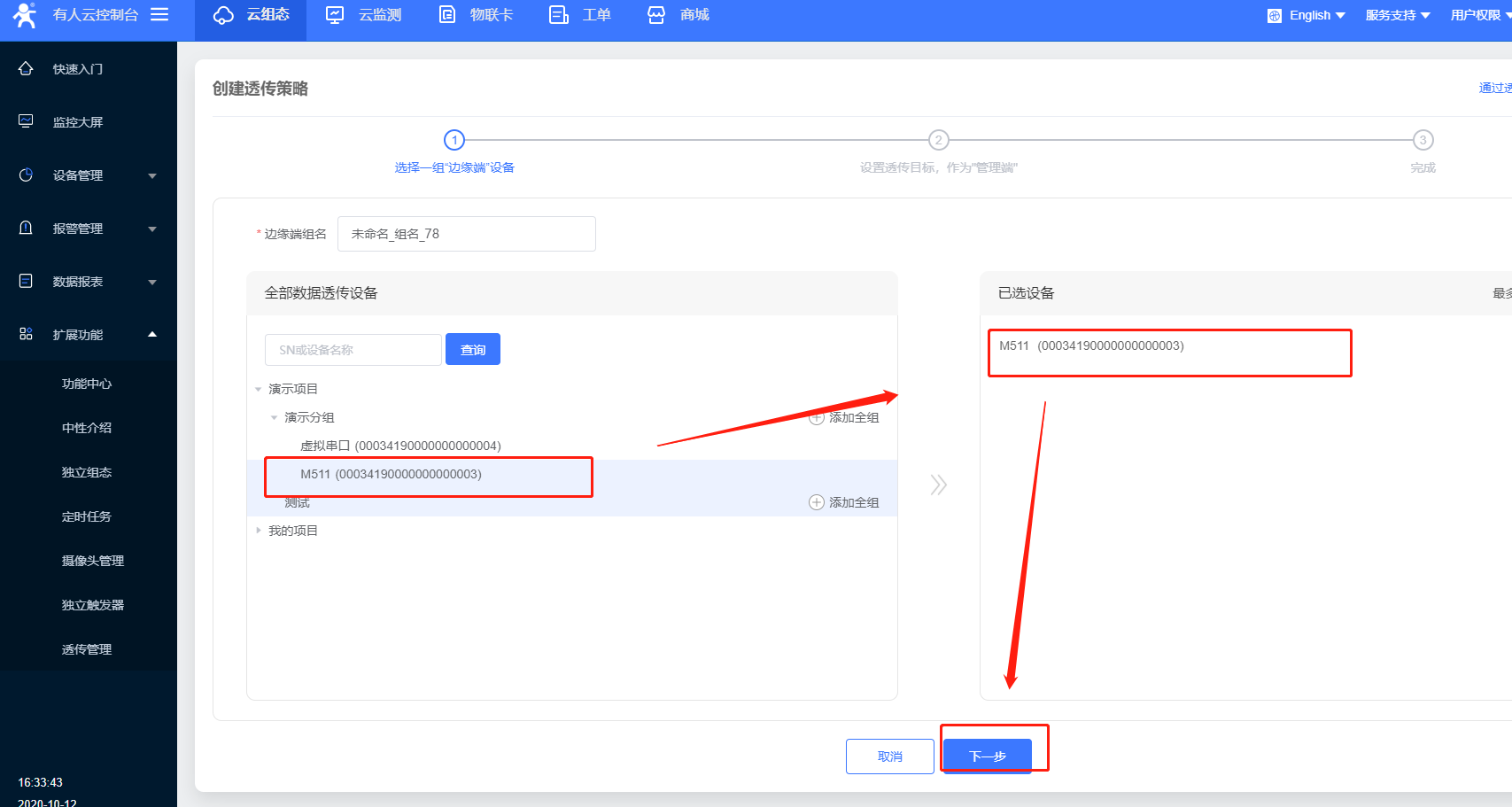 8.透傳策略自定義命名,先選擇透傳組一側(cè)的設(shè)備,選中,可看到右端出現(xiàn)選中的設(shè)備,點擊下一步