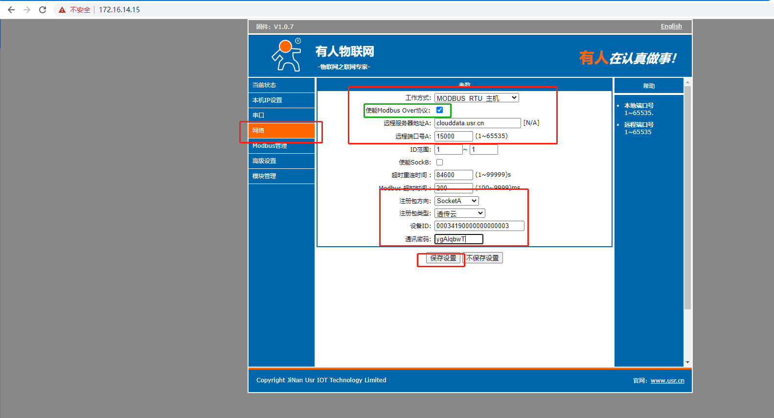 7. 設(shè)置串口的參數(shù),工作方式選擇MODBUS RTU主機(jī),遠(yuǎn)程服務(wù)器地址:clouddata.usr.cn,遠(yuǎn)程端口:15000。一定要勾選MODBUS OVER協(xié)議。