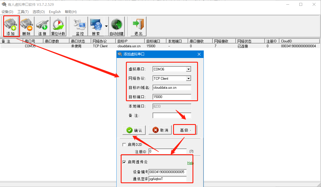 點(diǎn)擊高級(jí),將云上生成的設(shè)備編號(hào)和密碼填入,點(diǎn)擊確定,生成虛擬串口