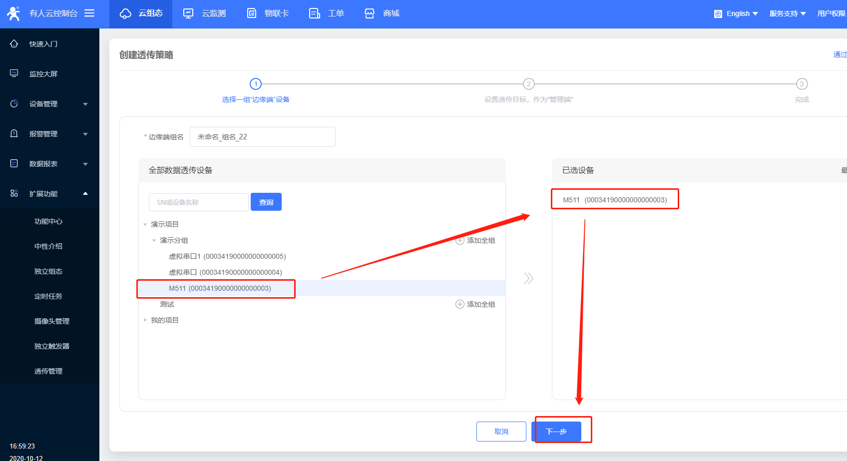 8.透傳策略自定義命名,先選擇透傳組一側(cè)的設(shè)備,選中,可看到右端出現(xiàn)選中的設(shè)備,點(diǎn)擊下一步