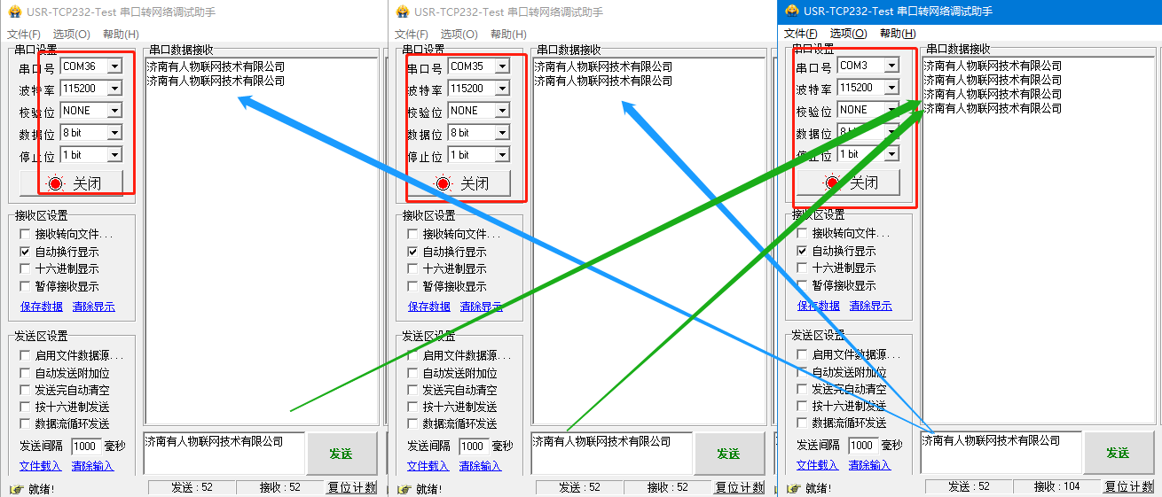 11.用串口調(diào)試助手打開虛擬串口生成的串口和M511的串口(三個(gè)串口參數(shù)必須相同),進(jìn)行數(shù)據(jù)互發(fā)