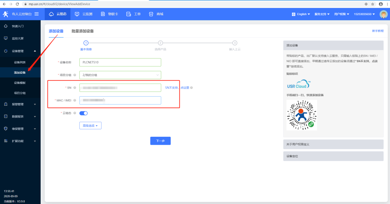 2.添加設(shè)備,使用PLCNET510背面標(biāo)簽的MAC和SN添加,點(diǎn)擊下一步