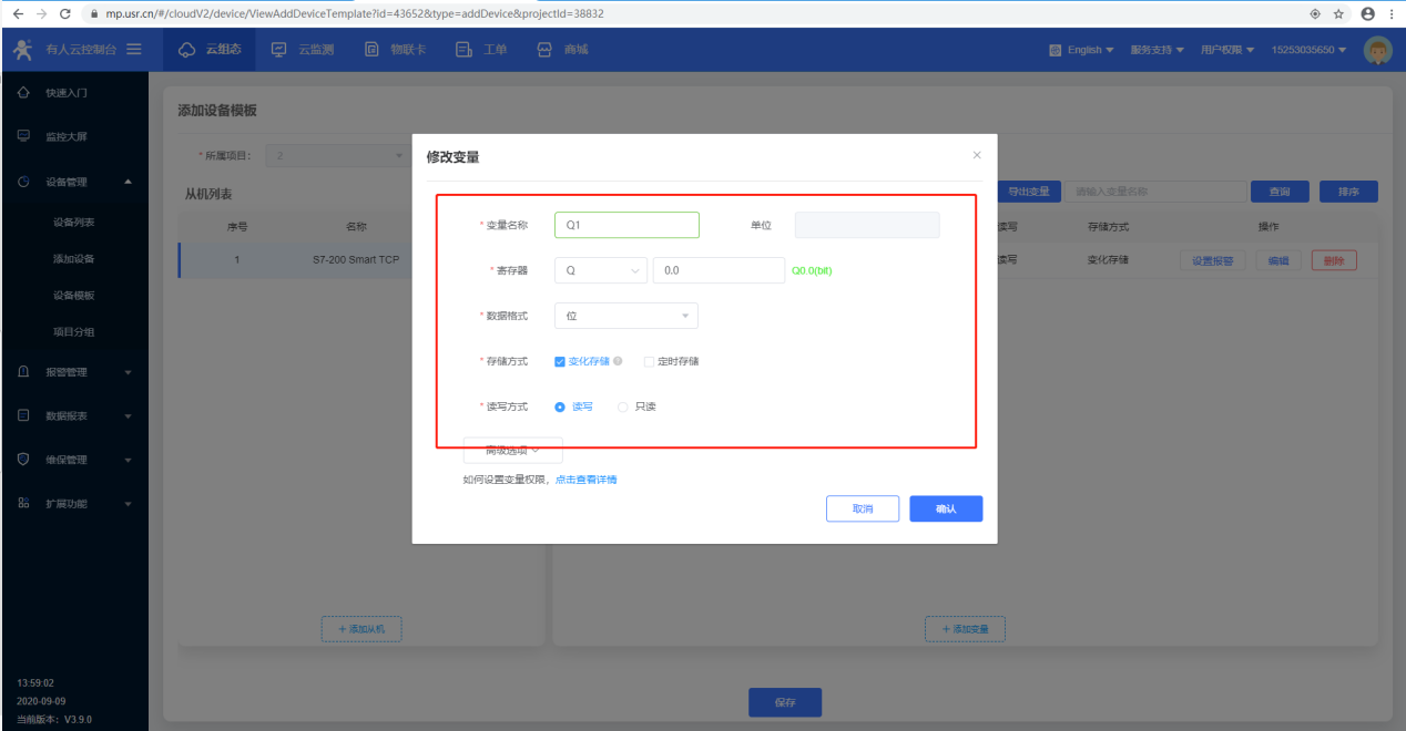 4.下一步填寫從機(jī)和變量,從機(jī)IP為PLC的IP,從機(jī)端口為PLC的端口