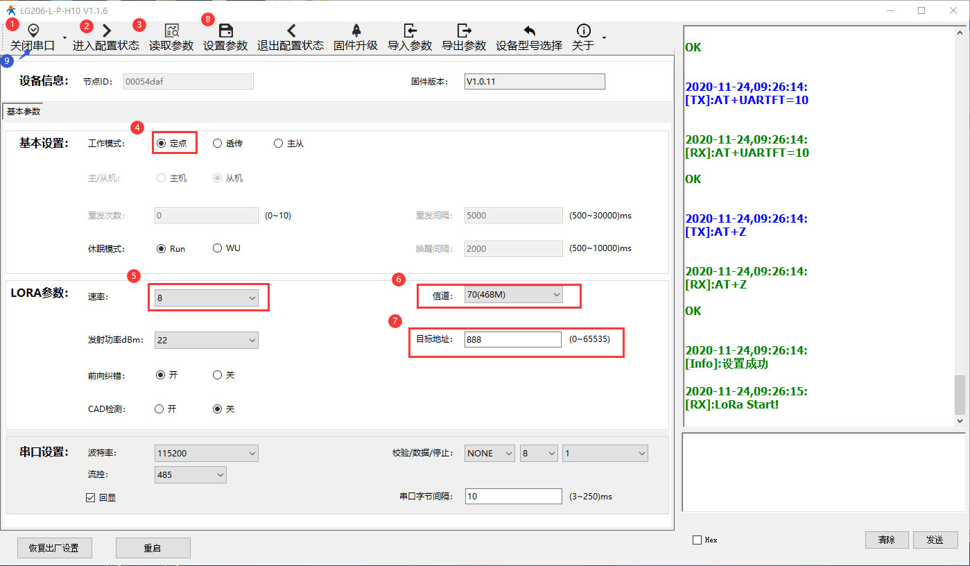 打開LoRa設(shè)置軟件→ 選擇LG206-L-P-H10 → 依次點擊打開串口(選擇A、B對應(yīng)的串口號,串口參數(shù):115200,None,8,1,NFC) → 進入配置狀態(tài) → 讀取參數(shù) → 配置圖中的參數(shù) → 一鍵設(shè)置所有參數(shù) → 關(guān)閉LoRa設(shè)置軟件。