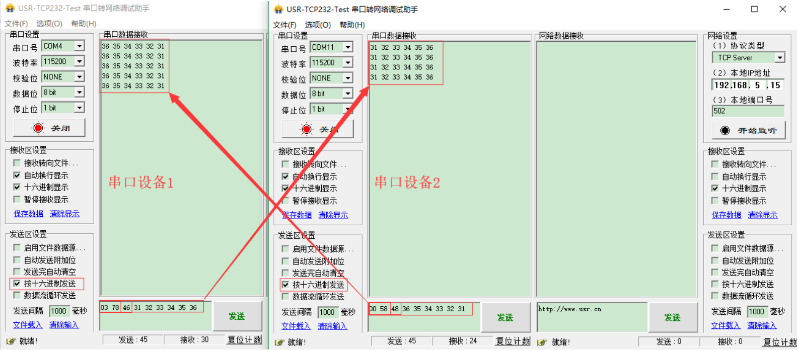 啟動兩個USR-TCP232-Test(模擬串口設(shè)備1,2)分別連接LoRa數(shù)傳終端A、B的串口,使用串口設(shè)備1發(fā)送數(shù)據(jù)串口設(shè)備2可接收數(shù)據(jù)(反之亦然)。
