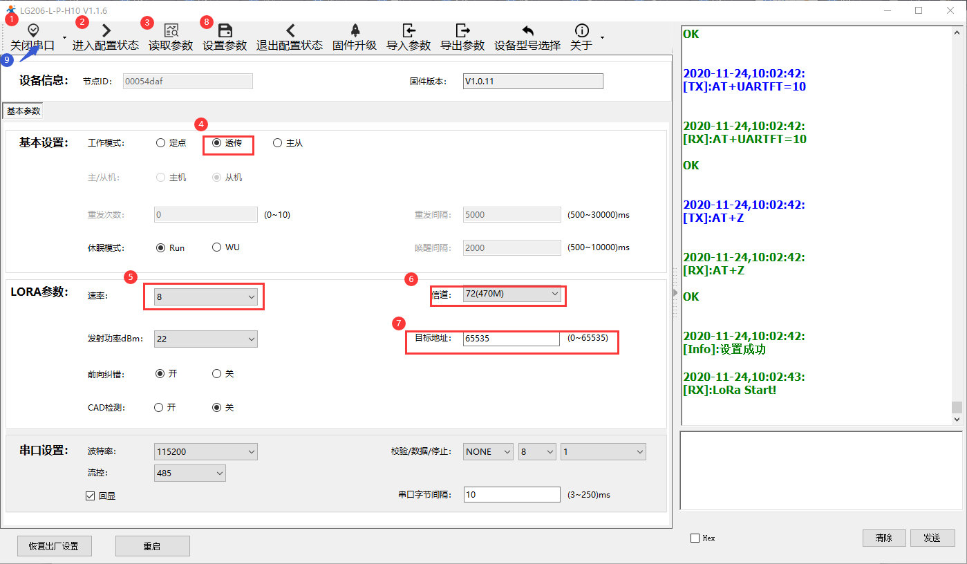 設(shè)備B:透傳模式,速率8,信道72,目標(biāo)地址888。