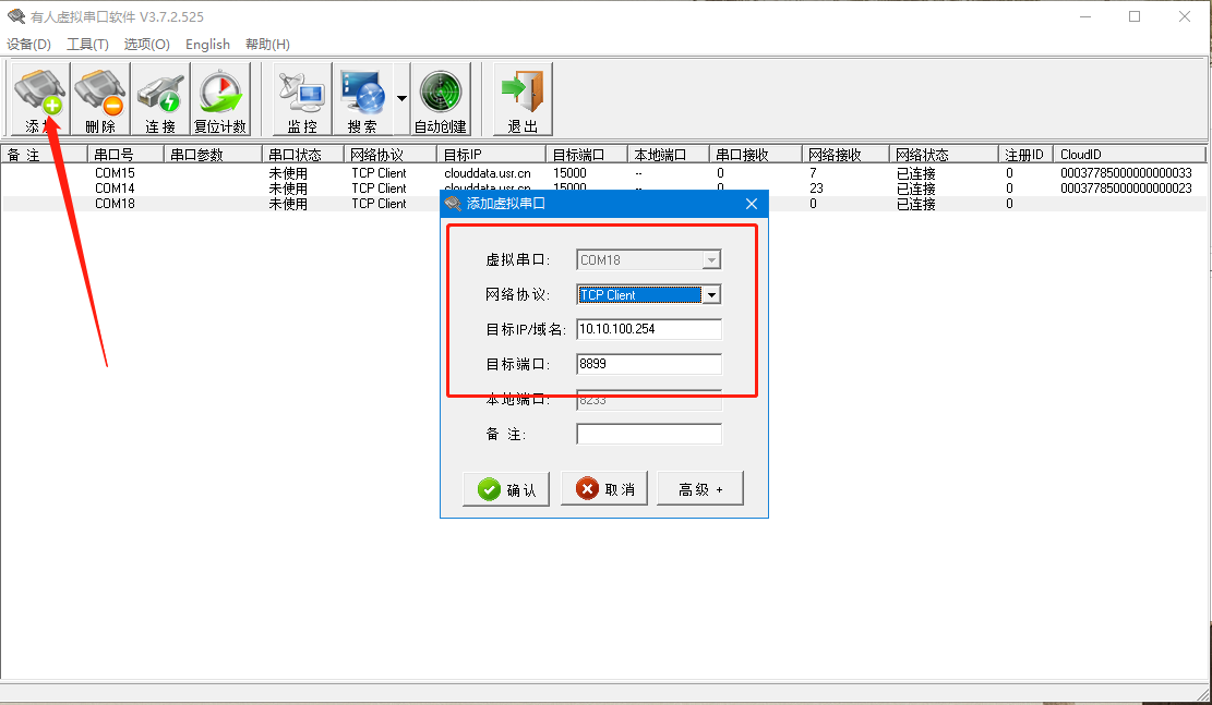6.打開虛擬串口軟件,點擊添加,選擇TCP client,目標IP為W610的IP,目標端口為W610的本地端口,點擊確認